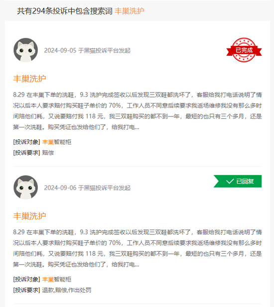 但丰巢洗护服务却同样被用户“痛恨”。仅在黑猫投诉平台上,截至目前丰巢有多达294条投诉,涉及到物品损坏、染色、效率低、丢件等问题;同时,丰巢承诺“洗坏必赔”,但损坏物品之后,却拒绝赔付或折价赔付。